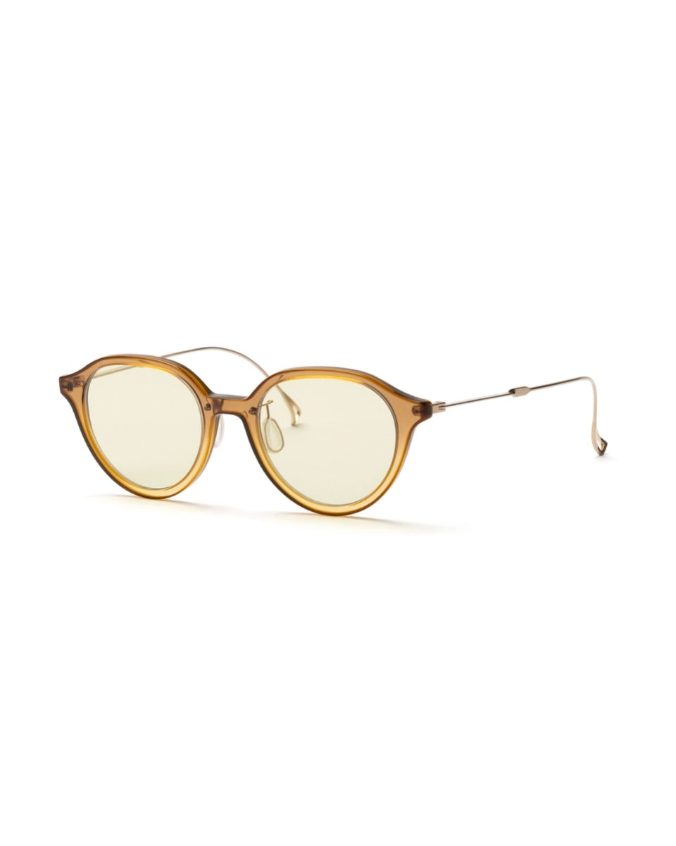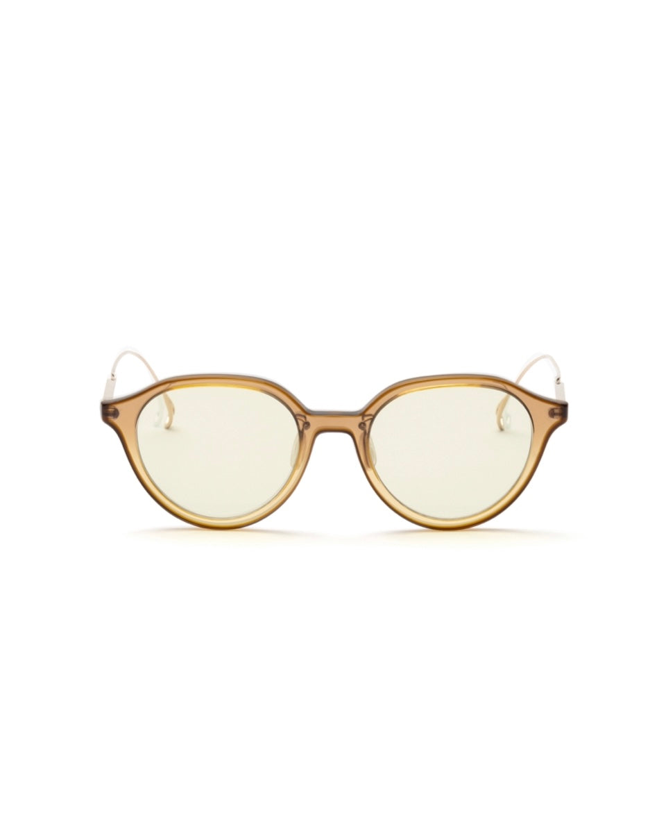 Sonnenbrille im Panto-Stil mit sattem Ausdruck und einem Gefühl von Volumen auf der Vorderseite. Sie verfügt über einen Frontrahmen mit einer scharfen „Kontur“, die durch das Zusammenkleben zweier Stofffarben in einem speziellen Verfahren entsteht. Die blitzverspiegelten farbigen Gläser, deren Farbe sich je nach Winkel ändert, drücken ein Gefühl von Verspieltheit aus und betonen in Kombination mit dem kompakten Rahmen einen modernen und sportlichen Eindruck. Es ist ein Artikel, der einen sauberen und schönen Eindruck mit einem sanften Komfort mit einem Hochleistungs-Nasenpolster aus Silikon kombiniert.