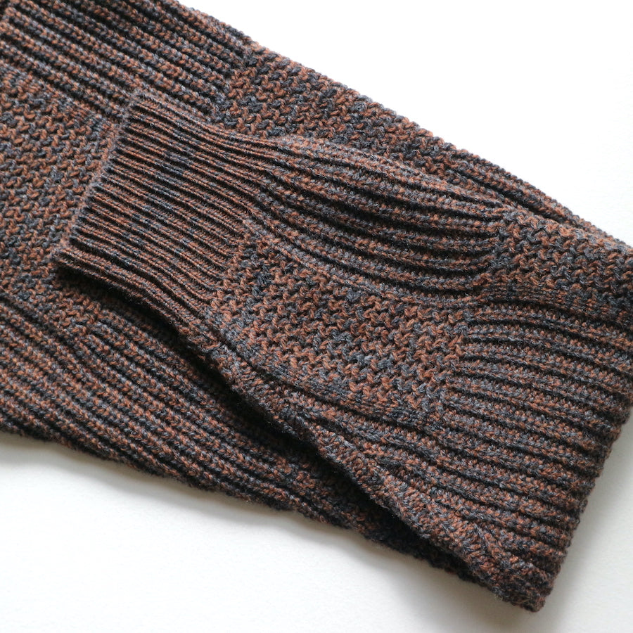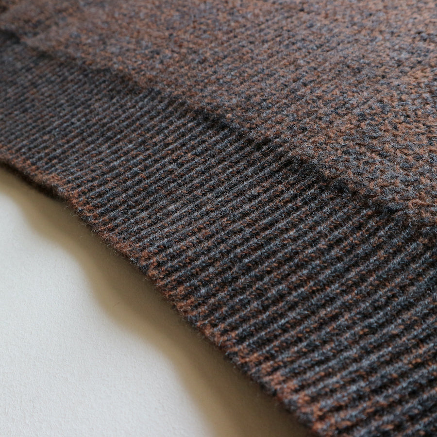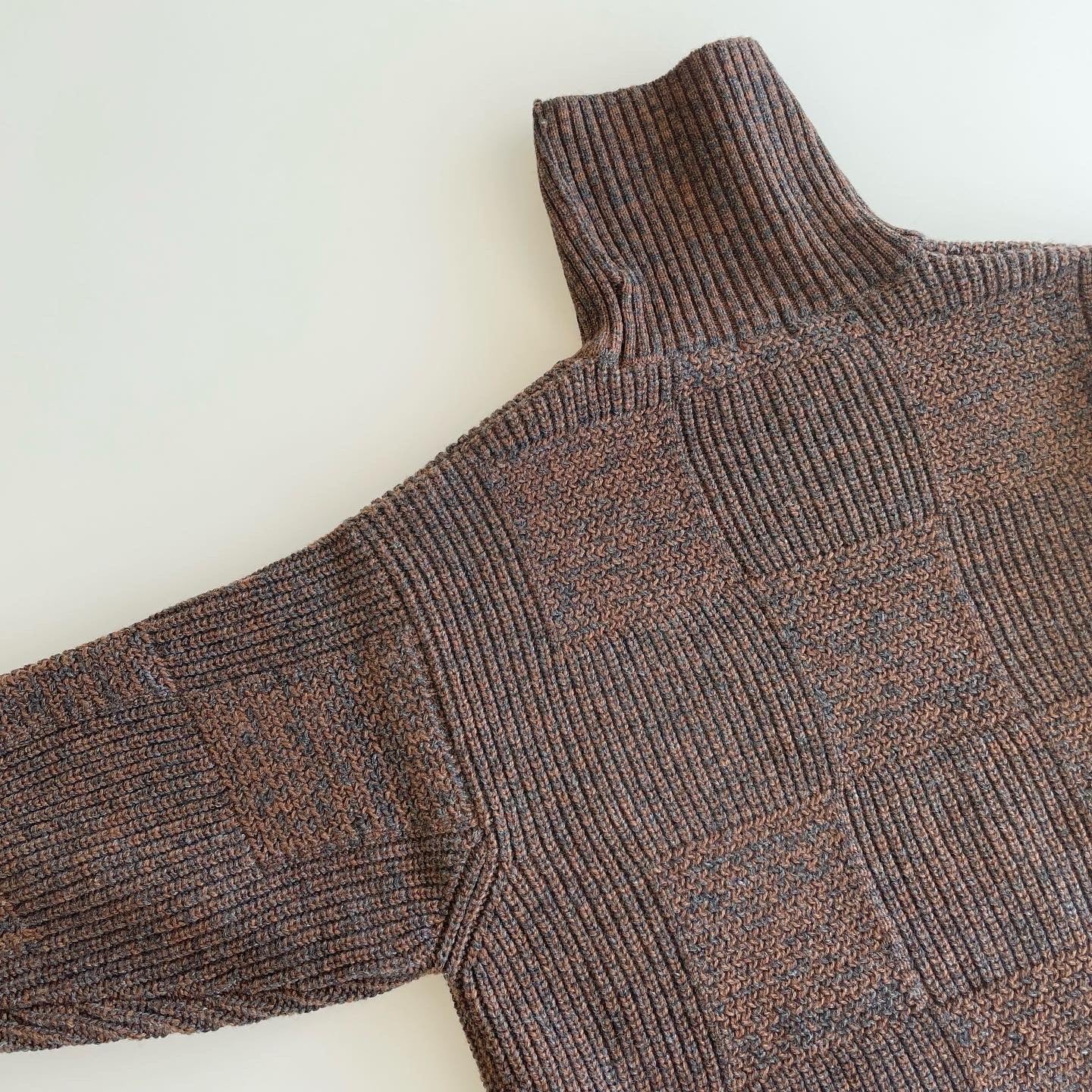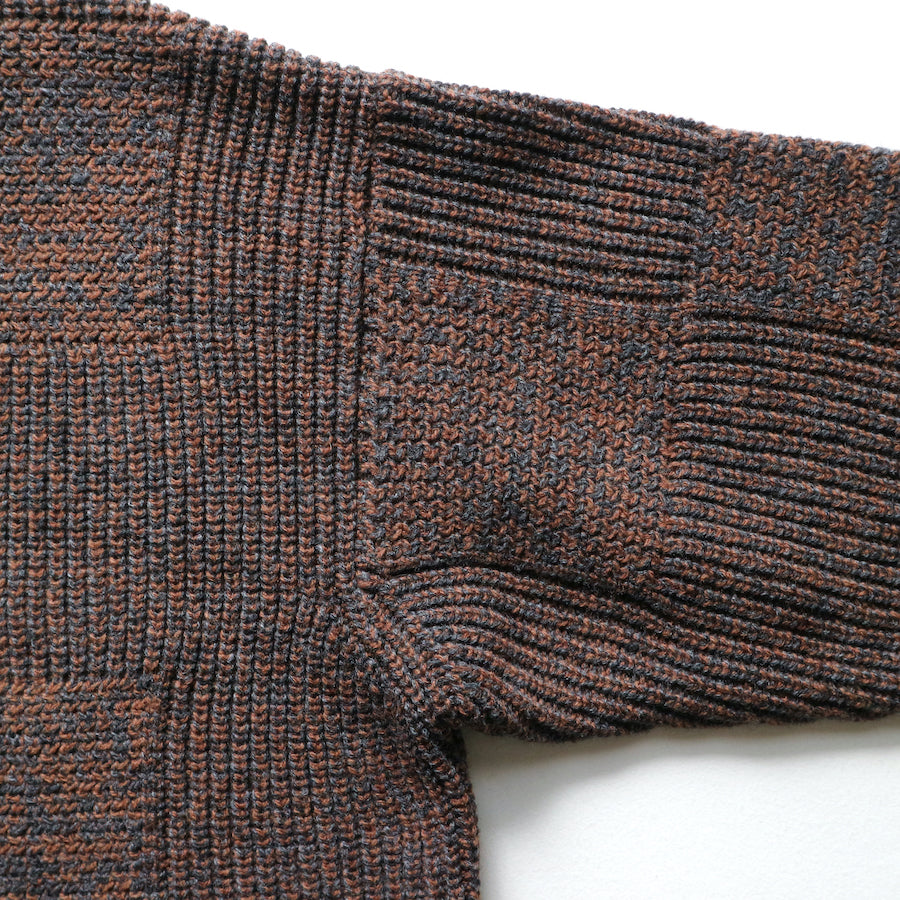 Ein spezieller Wollpullover mit Wechselstrickmuster und britischem Pullovermotiv der 80er Jahre, der ein stimmungsvolles Blockkaromuster aufweist. Das verwendete Material ist 100 % extrafeines Lamm aus der australischen Region „Geelong“, die als weltweit führender Produzent hochwertiger Lammwolle bekannt ist. Das Garn, das viel zarter und glatter als gewöhnliche Wollfasern ist, besteht aus hochwertigem Material, das Ihnen ein warmes und bequemes Tragegefühl ohne Kribbeln bietet und Ihnen die ursprüngliche Textur von Wollstrick mit hervorragender Wärme- und Feuchtigkeitsspeicherung bietet. Das Design basiert auf dem bestehenden britischen Pullover der 80er Jahre. Eine spezielle Kombination aus zwei unterschiedlichen Garnfarben, die bei Militärstrickwaren wie einseitigen Rippen und rippenförmigen Strickwaren zu sehen ist, wird in einer quadratischen Form nebeneinander gewechselt. Es ist eine sehr seltene und seltene Strickstruktur, und die Rippenstrickware hat eine hohe Wärmespeicherung, da sie Dicke erzeugt, und die texturreiche Färbung, die zwei Garnfarben mischt, ist ein Pullover, der eine einzigartige Atmosphäre und ein Gefühl von Luxus vermittelt. Die Silhouette hat eine normale Passform, die es Ihnen ermöglicht, sich zu entspannen und sie mit viel Weite und Schulterbreite zu tragen. Das Nähen erfolgt durch „Linking“, eine hochwertige Strickherstellungsmethode, und es wird mit einer Methode hergestellt, die Zeit und Mühe erfordert, um jedes Stück von wertvollen einheimischen Handwerkern fertigzustellen, von denen es nur noch wenige gibt, und die die Textur des Pullovers weiter verbessert. Ich bin. Dieser Artikel ist ein sehr seltener in Japan hergestellter Linking-Pullover, der derzeit mit einer Inlandsproduktionsrate von nur „1,9 %“ nicht in Massenproduktion hergestellt werden kann, da die meisten Strickprodukte im Ausland hergestellt werden.