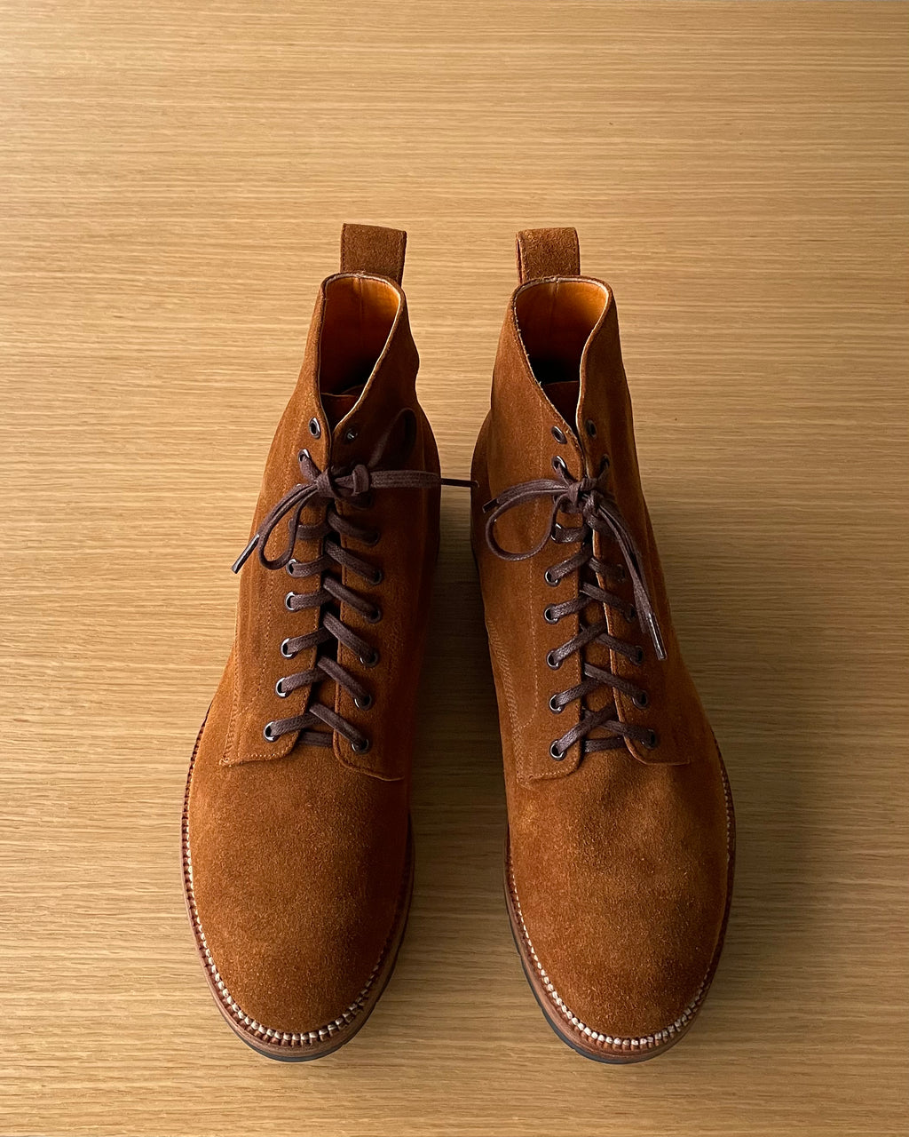 Yuketens Eric-Stiefel wird in Mexiko vollständig von Hand geschnitten und auf halbmodifizierten amerikanischen Leisten aus den 1950er Jahren gefertigt, um Komfort und Stil optimal zu vereinen. Die grundlegenden Komponenten dieses Stils sind das Obermaterial aus Wildleder und die Basis, die aus einer Kombination aus pflanzlich gegerbtem Leder und einer exklusiven Profilsohle aus weicher Gummimischung von Vibram besteht.