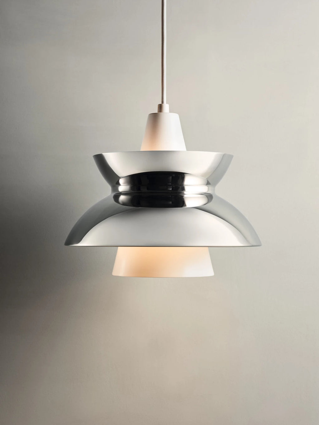 Ursprünglich in den 1950er Jahren eingeführt. Wurde in enger Zusammenarbeit zwischen der Marinebaubehörde und Louis Poulsen entworfen. Die Pendelleuchte wurde viele Jahre lang in den Gebäuden der Marine für viele verschiedene Zwecke wie Kantinen und Büros verwendet. Die Navy Pendant, so der damalige Name, wurde aufgrund der einzigartigen Lichteigenschaften und Nützlichkeit weithin verwendet. Erst in den frühen 1980er Jahren wurde das Produkt aus den Louis Poulsen-Katalogen genommen. Das Design wirkt zeitlos, hat aber eine starke Verbindung zum New Look der 1950er Jahre. Es wurde 2012 als Doo-Wop in neuen Farben und einer Messingversion wieder eingeführt. 2017 mit neuen Metalleditionen in Kupfer und Edelstahl. Die Produktionsmethoden sind dieselben und die Schirme werden immer noch von Hand gedreht und mit dem feinen gerollten Rand versehen, der den Schirmen ein besonderes optisches Volumen verleiht. Besonders die Messingvariante stellt eine Herausforderung für den Handwerker dar, da sie aus einer massiven Messingplatte gedreht wird und poliert erscheint.
