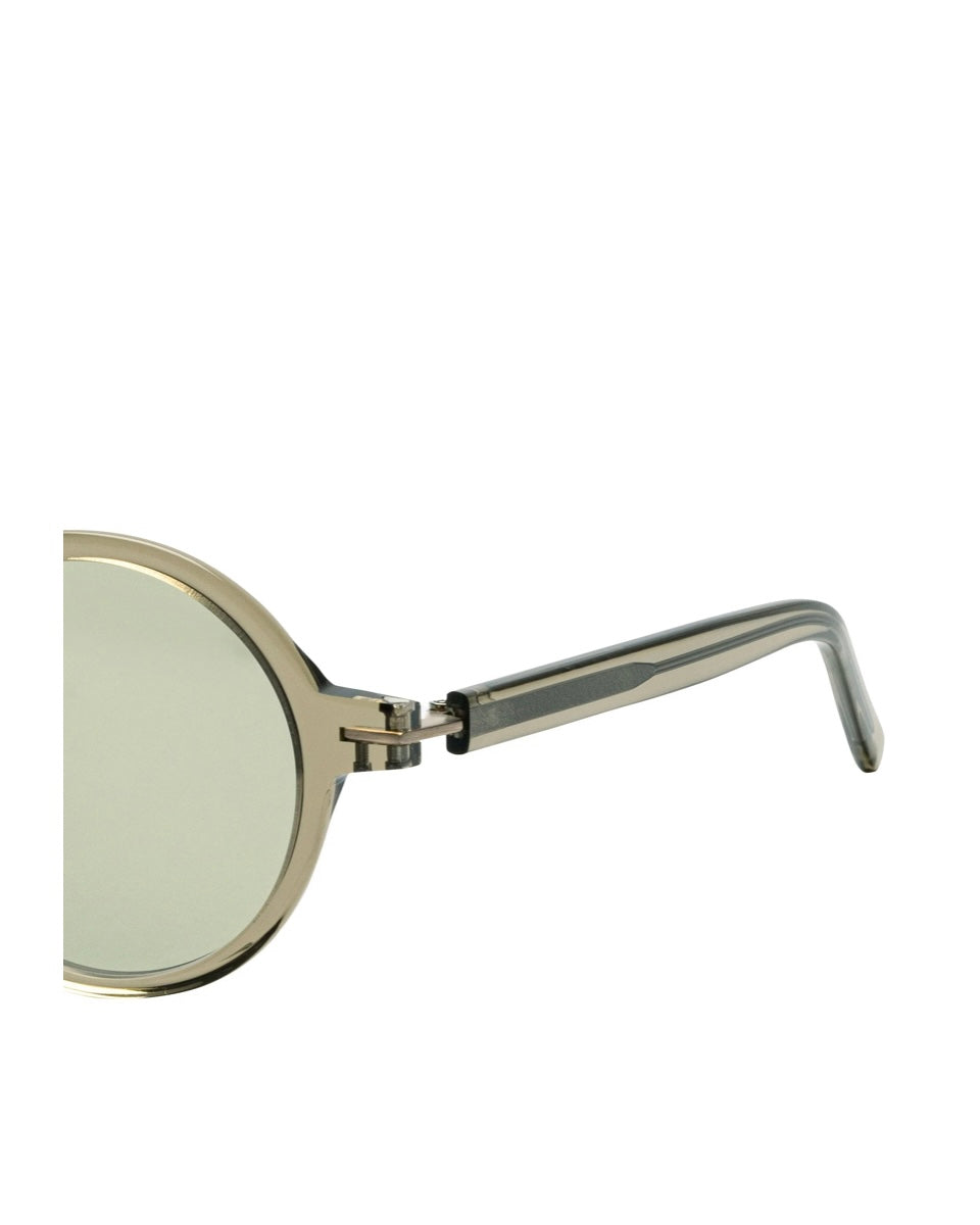 Inspiriert von zwei geometrischen Konfigurationen haben diese runden Sonnenbrillen eine starke Präsenz und sind so gestaltet, dass sie sich als Teil des menschlichen Gesichts anschmiegen. Die Vorderseite zeigt einen flachen und scharfen Ausdruck mit wenig Unebenheiten, und im Gegensatz dazu weist die Rückseite, die näher am menschlichen Gesicht liegt, weiche Linien mit abgesenkten Kanten auf. Die feine Verarbeitung durch handwerkliche Handarbeit koexistiert mit einem klaren und modernen Eindruck von Geometrie und angenehmem Tragekomfort.