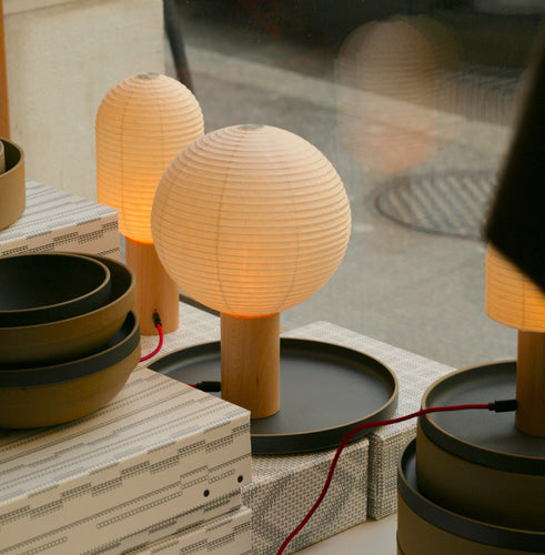 In diesem Monat kündigte Shiraki Kougei, ein Hersteller von o-Bon Chōchin (Papierlaternen), die Veröffentlichung von Torchin an, einer Serie tragbarer, moderner Lampen, die unter Beratung und Produktionsanleitung von Nakagawa Masashichi Shoten und in Zusammenarbeit mit dem Designstudio Tent hergestellt wurden. Shiraki Kougei mit Sitz in der Präfektur Fukuoka ist auf den regionalen Yame-Stil der o-Bon Chōchin spezialisiert – mit Washi-Papier überzogene Laternen mit Hibukuro -Rahmen (Feuerkammer) aus spiralförmigen Bambusstreifen oder Draht. Die neue Torchin-Serie übersetzt fünf einfache geometrische Formen – Kreis, Länglich, Oval, Quadrat und Glocke – in dreidimensionale Feuerkammerformen, die an Yame-Ellipsoide erinnern. Ein einfacher zylindrischer Ständer aus Buchenholz verwandelt jede Torchin in eine Tischlampe, die auch wie eine Fackel gehalten werden kann. Nichts unterbricht das moderne Design von Tent mit seinen klaren Linien. Das durchscheinende Washi des Schirms ist weiß belassen, ein berührungsempfindlicher runder Knopf ist so angebracht, dass er die Feuerraumöffnung oben sauber abdeckt und da es sich um eine wiederaufladbare Lampe mit einer Laufzeit von bis zu 35 Stunden auf der dunkelsten Einstellung handelt, wird während des Gebrauchs kein unansehnliches Kabel benötigt. - The Japan Times