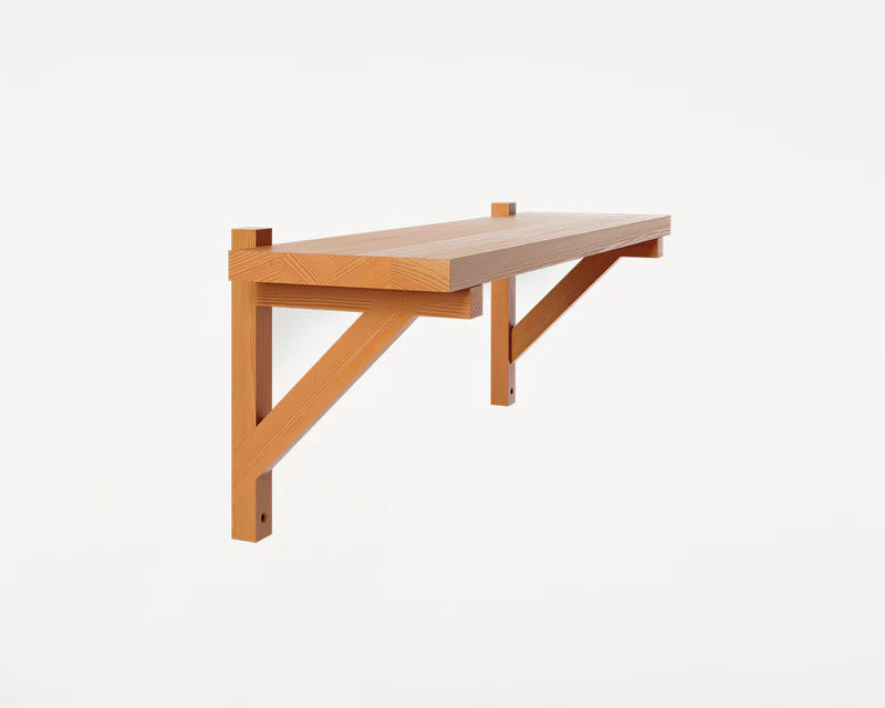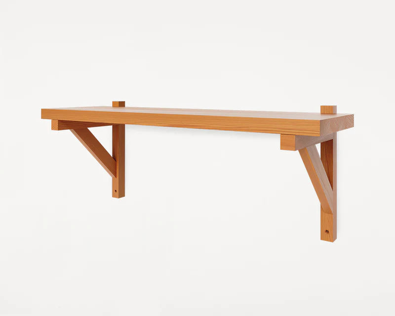 Das Bracket Shelf, das in Zusammenarbeit mit dem Kopenhagener Designstudio Frederik Gustav entworfen wurde, ist ein schwebendes Möbelstück zur Aufbewahrung oder Präsentation von Objekten aus massiver, geölter Kiefer, das durch ein strukturelles Element, die Klammer, hervorgehoben wird. Dieses rein funktionale Element wurde zu einem ästhetischen Merkmal, wird an der Wand montiert und stützt das Regal, wodurch es Stabilität erhält – ein architektonischer Einfluss, eine Anspielung auf zeitlose Konstruktion.