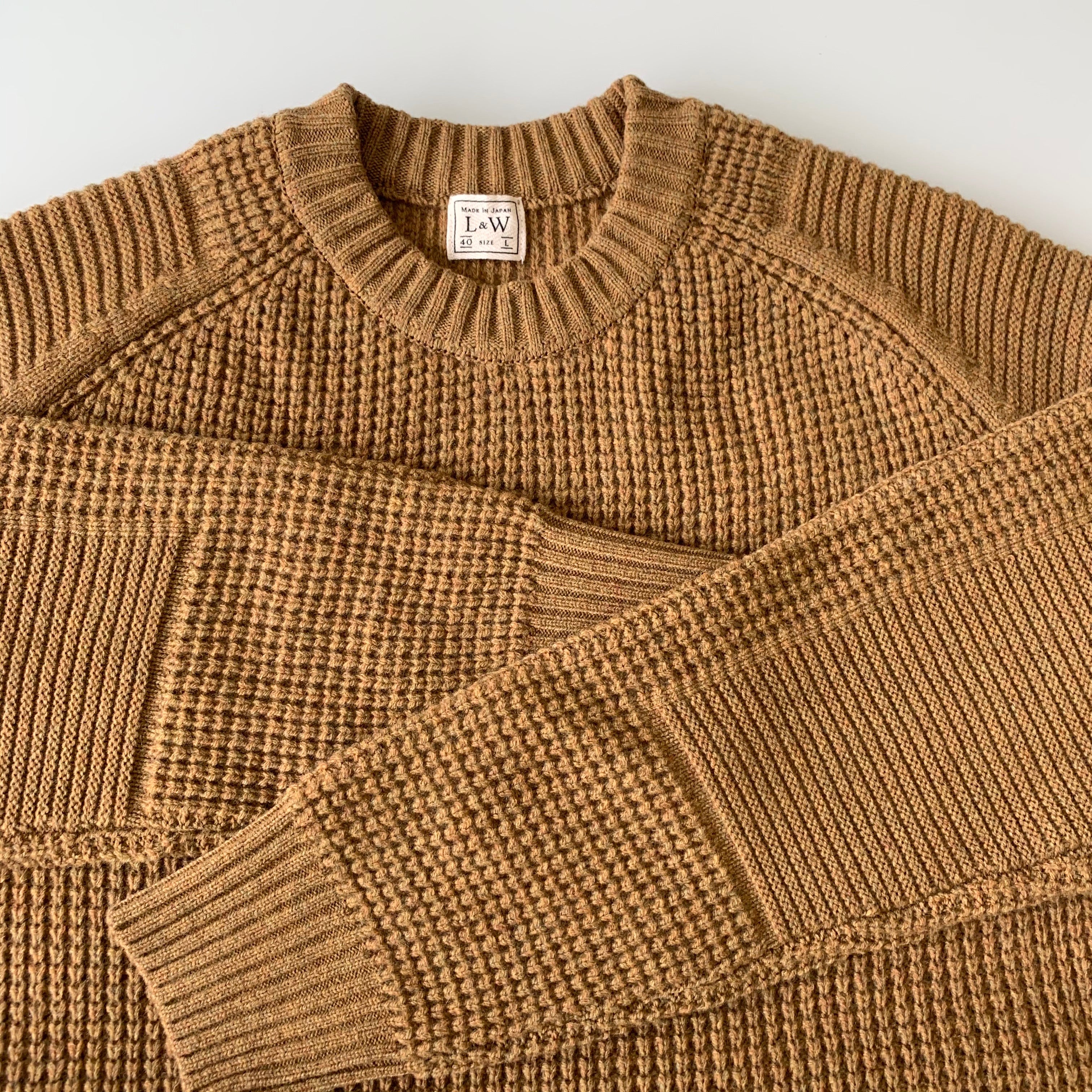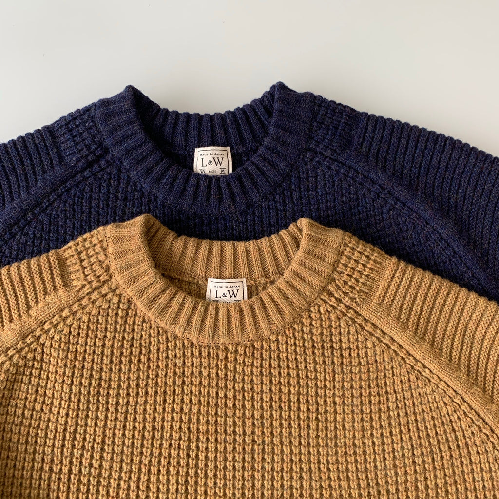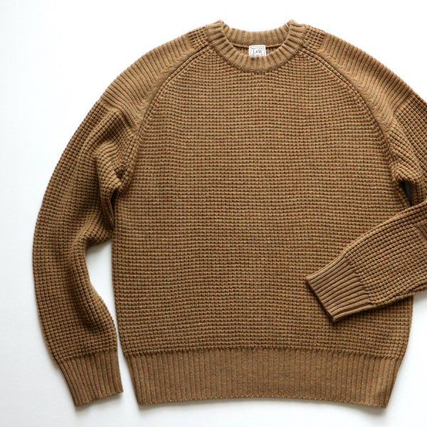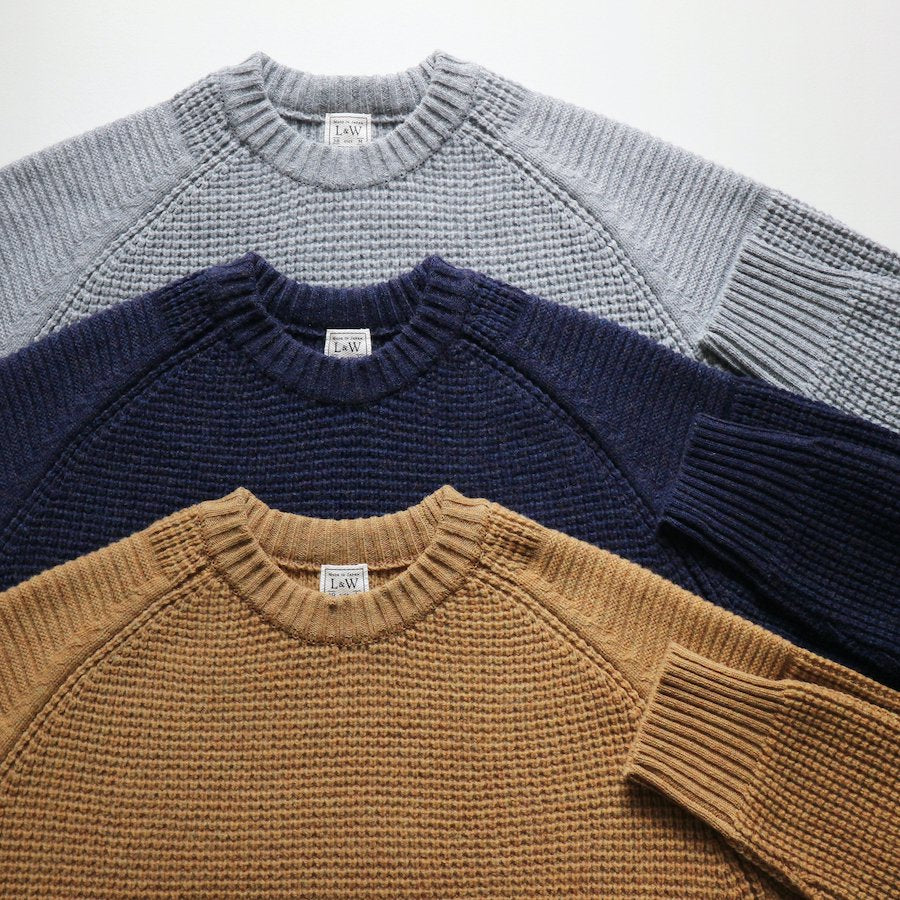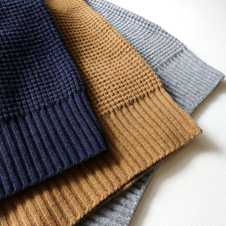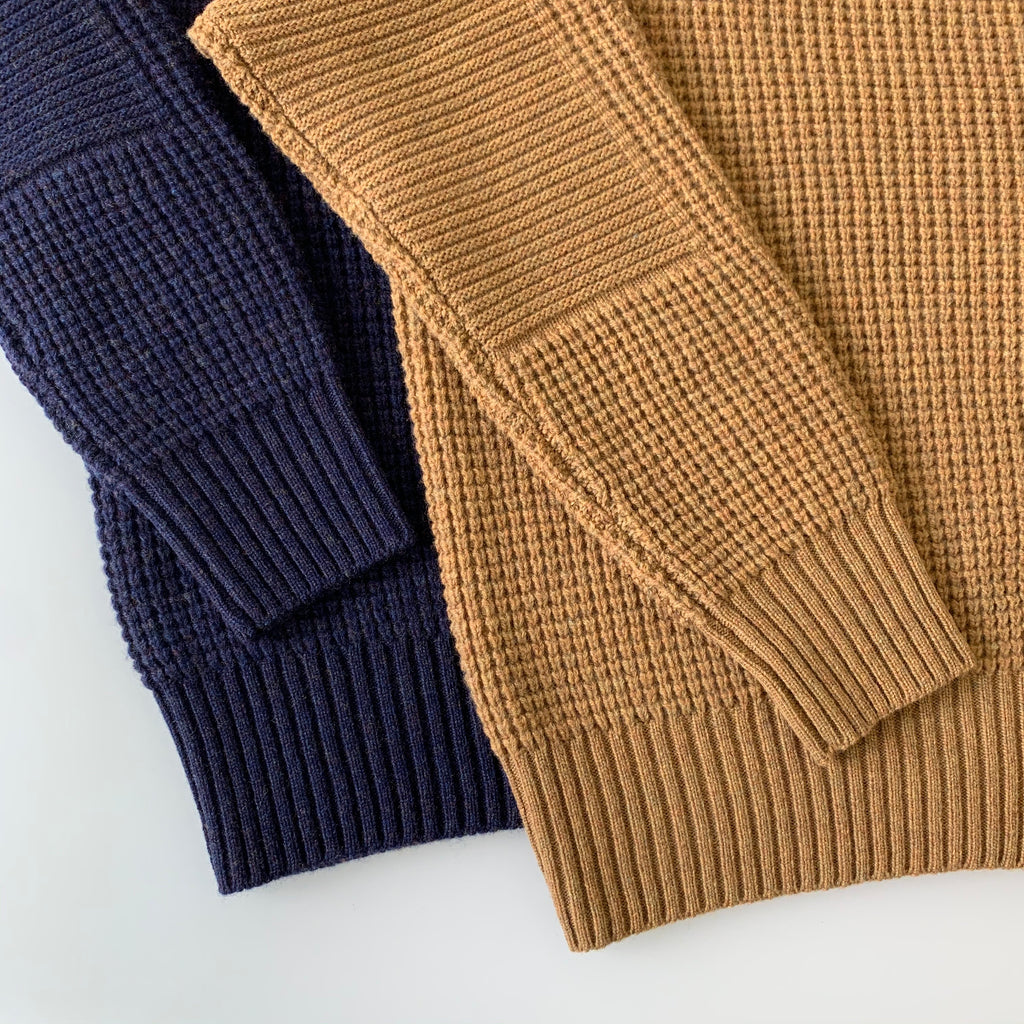 The SWEATER series uses 100% of the highest quality Super Lamb, which is both comfortable and textured. The material used is 100% Extra Fine Lamb from the "Geelong" area of ​​Australia, which is known as the world's leading producer of high-quality lamb wool. While ordinary wool fibers have a thickness of about 23 to 30 microns, this lamb wool is a very delicate and smooth thread of about 18.5 microns, which is also used for underwear, and has excellent heat retention and moisture retention. We use high-quality materials that allow you to feel the warmth of knitwear and the comfort of wearing it without tingling. The design is based on a raglan sleeve type military command sweater. The peculiar specification that another cloth is attached to the shoulders and elbows is expressed by switching "knitting", and the body part is knitted with a big waffle structure instead of one-sided knitting to give a feeling of thickness and heat retention. It is a sweater that gives off an atmosphere and a sense of luxury, with the garter knitting of the shoulders and elbows expressing the "reliable cloth" as the point. The silhouette is a regular fit with plenty of width. Raglan sleeves that can be worn without worrying about shoulder width and have high arm mobility. Sewing is formed by "linking", which is a high-class knit manufacturing method, and precious craftsmen in Japan, who are only a few now, take time and effort to finish each piece, further enhancing the texture and texture of the sweater. It is built by the method. At present, most of the knit products are made overseas, this item is a very rare "made in Japan" molded knit sweater that cannot be mass-produced with a domestic production rate of only "1.9%".