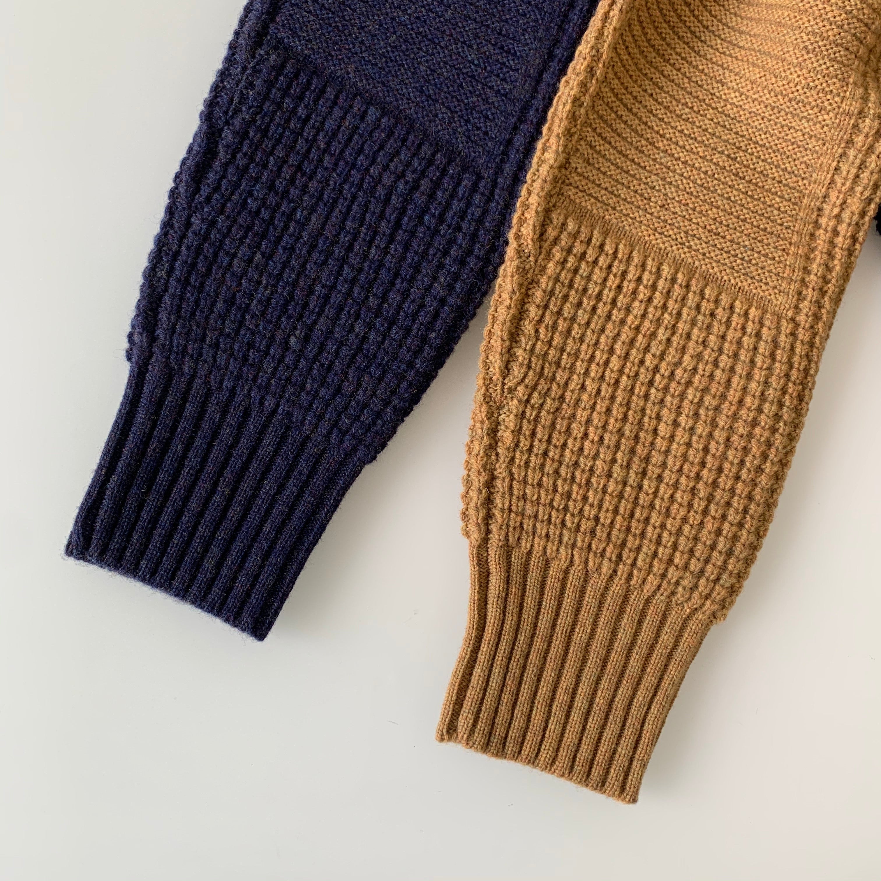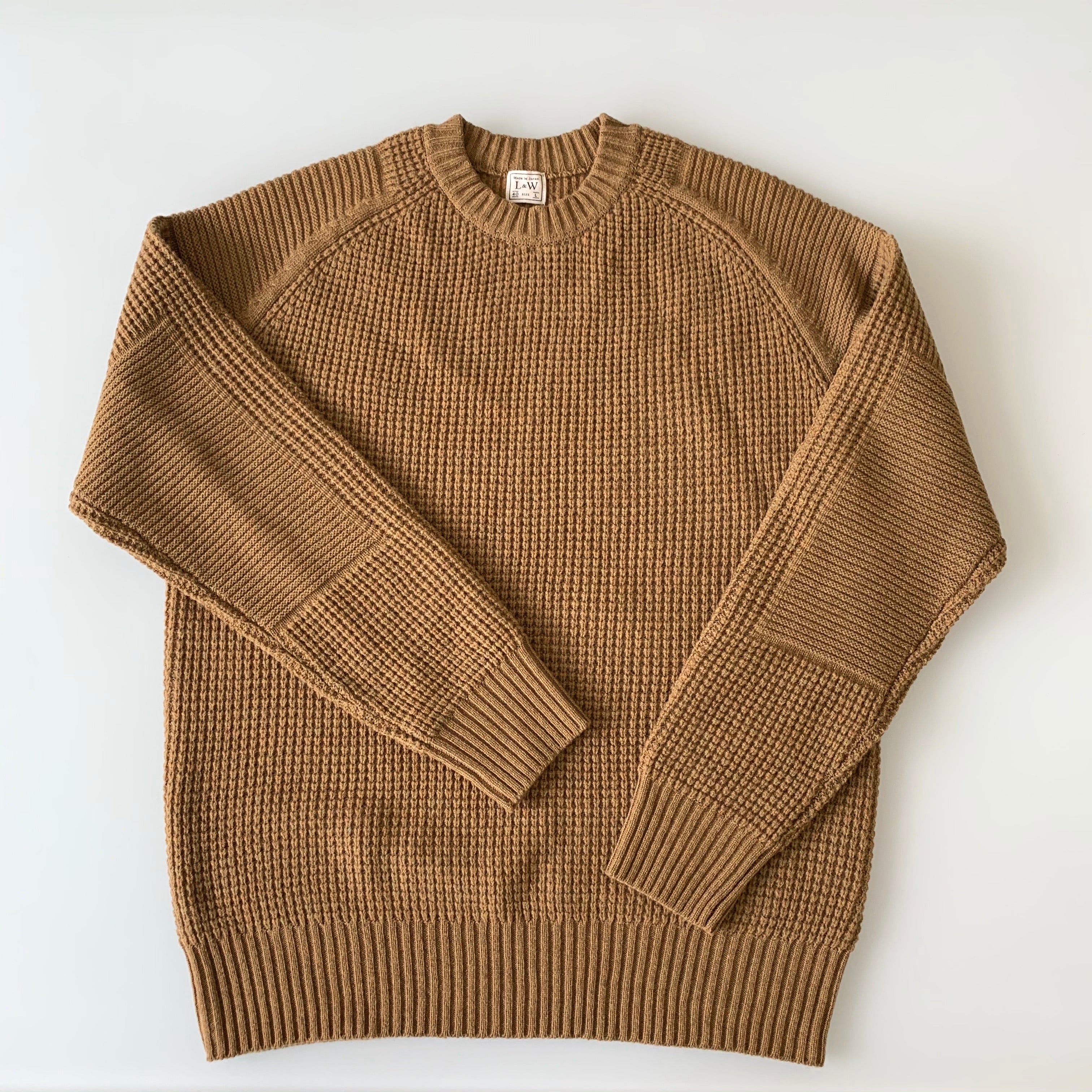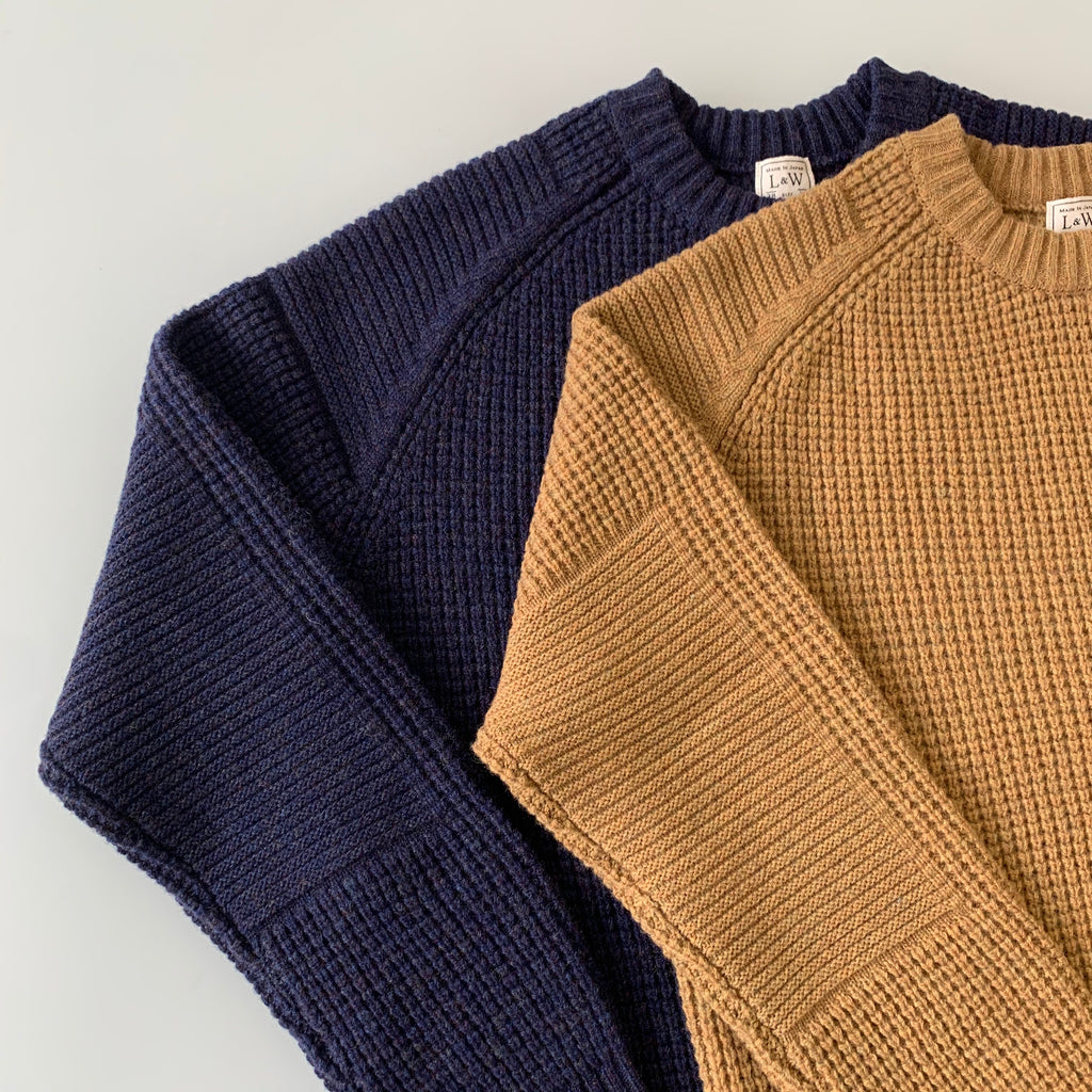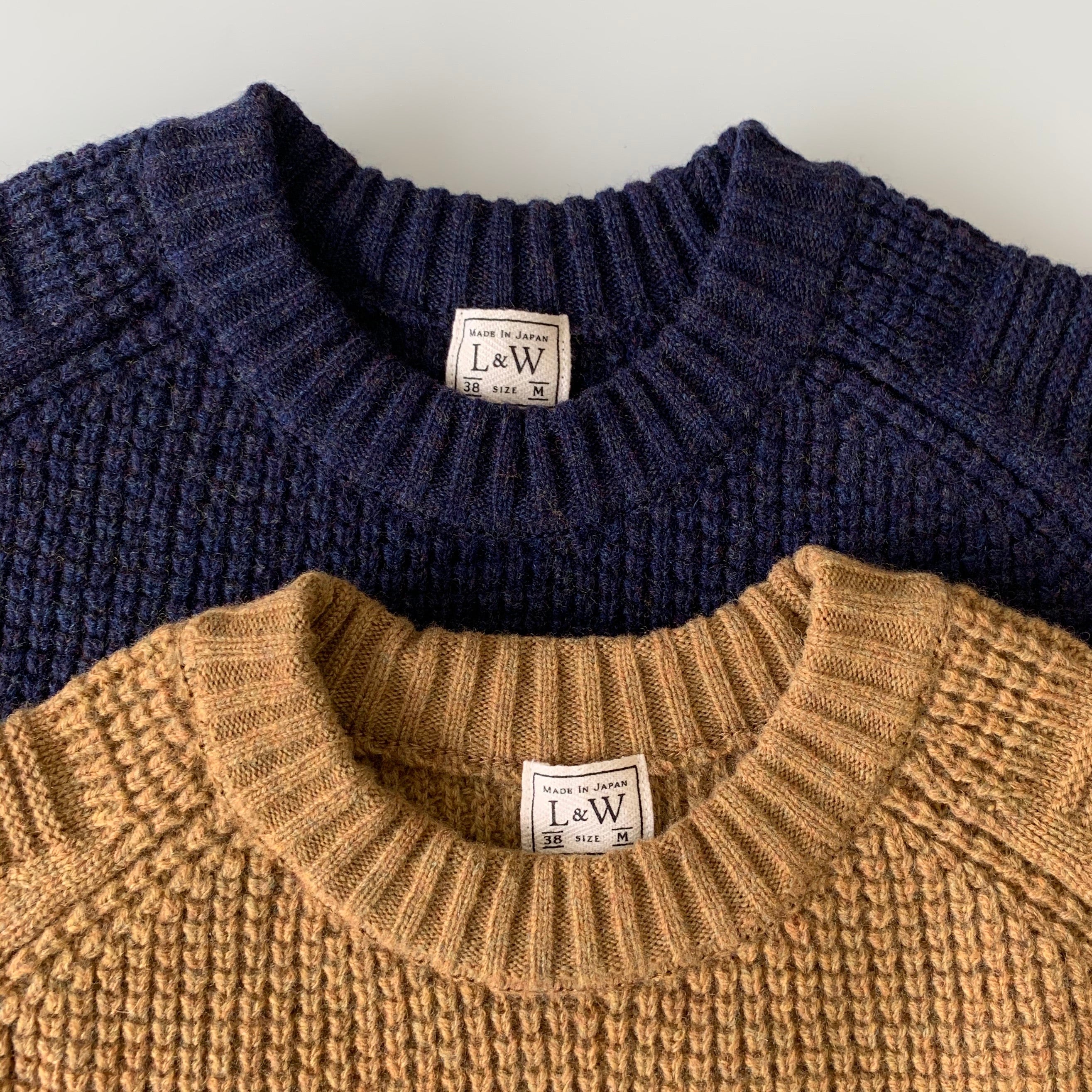 The SWEATER series uses 100% of the highest quality Super Lamb, which is both comfortable and textured. The material used is 100% Extra Fine Lamb from the "Geelong" area of ​​Australia, which is known as the world's leading producer of high-quality lamb wool. While ordinary wool fibers have a thickness of about 23 to 30 microns, this lamb wool is a very delicate and smooth thread of about 18.5 microns, which is also used for underwear, and has excellent heat retention and moisture retention. We use high-quality materials that allow you to feel the warmth of knitwear and the comfort of wearing it without tingling. The design is based on a raglan sleeve type military command sweater. The peculiar specification that another cloth is attached to the shoulders and elbows is expressed by switching "knitting", and the body part is knitted with a big waffle structure instead of one-sided knitting to give a feeling of thickness and heat retention. It is a sweater that gives off an atmosphere and a sense of luxury, with the garter knitting of the shoulders and elbows expressing the "reliable cloth" as the point. The silhouette is a regular fit with plenty of width. Raglan sleeves that can be worn without worrying about shoulder width and have high arm mobility. Sewing is formed by "linking", which is a high-class knit manufacturing method, and precious craftsmen in Japan, who are only a few now, take time and effort to finish each piece, further enhancing the texture and texture of the sweater. It is built by the method. At present, most of the knit products are made overseas, this item is a very rare "made in Japan" molded knit sweater that cannot be mass-produced with a domestic production rate of only "1.9%".