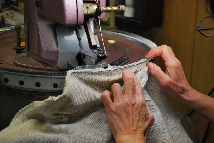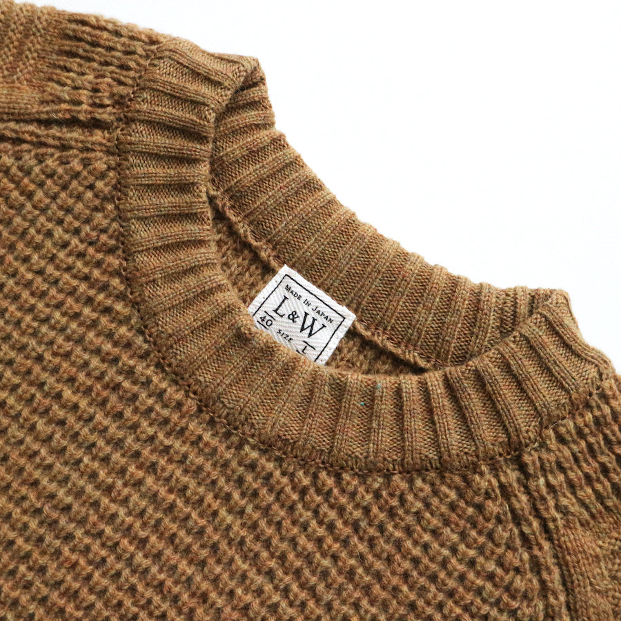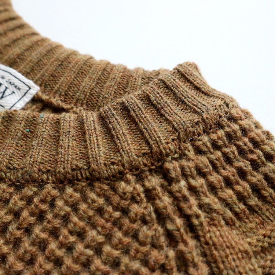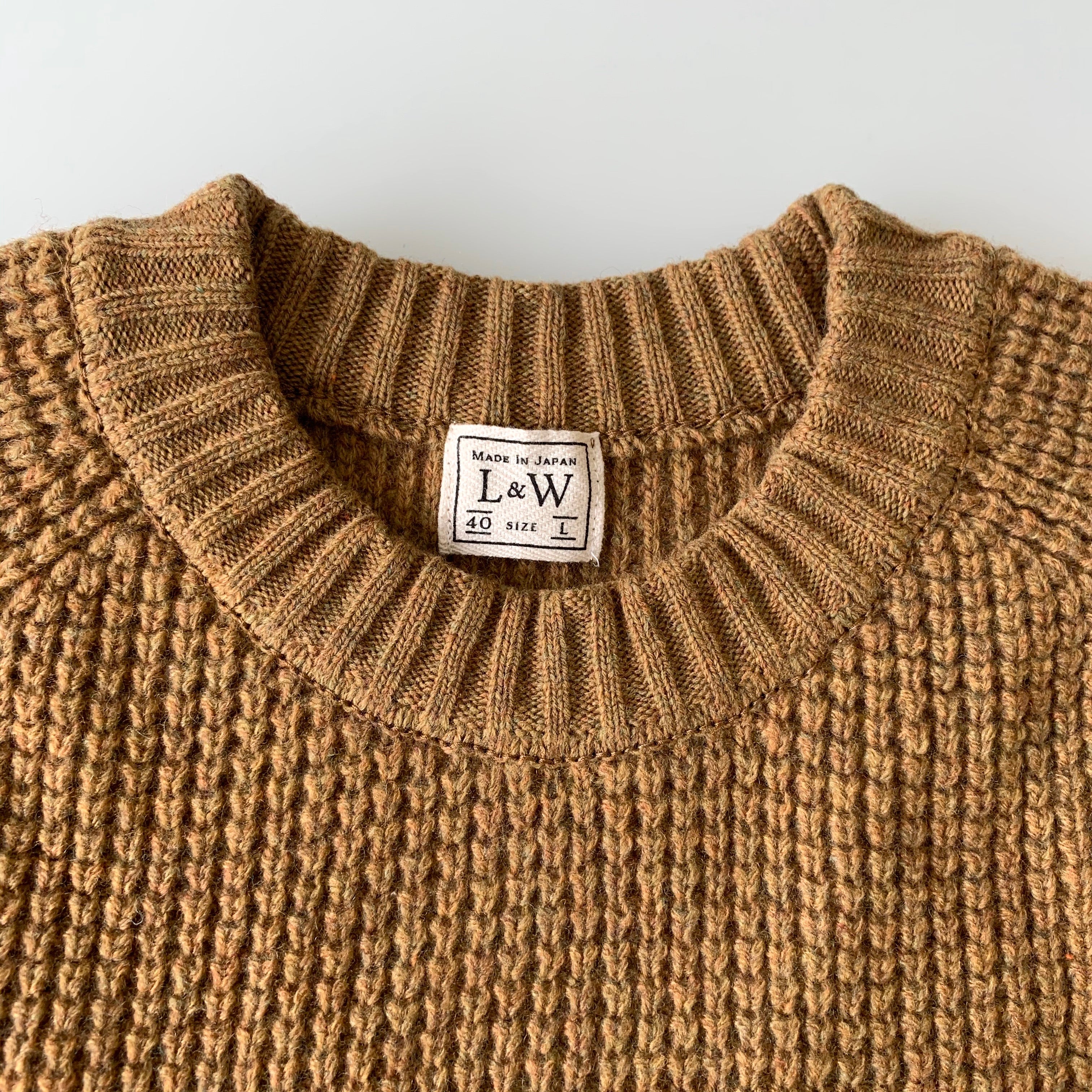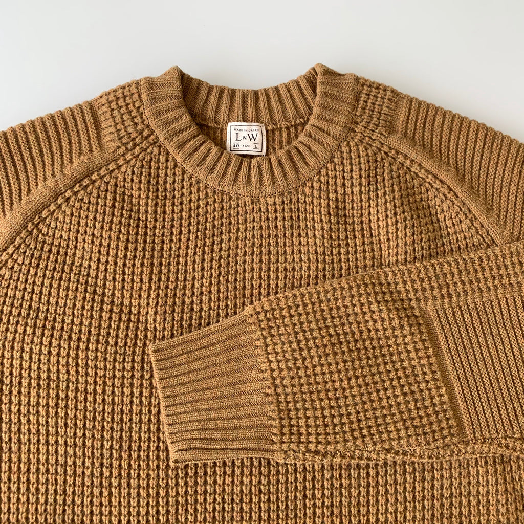 The SWEATER series uses 100% of the highest quality Super Lamb, which is both comfortable and textured. The material used is 100% Extra Fine Lamb from the "Geelong" area of ​​Australia, which is known as the world's leading producer of high-quality lamb wool. While ordinary wool fibers have a thickness of about 23 to 30 microns, this lamb wool is a very delicate and smooth thread of about 18.5 microns, which is also used for underwear, and has excellent heat retention and moisture retention. We use high-quality materials that allow you to feel the warmth of knitwear and the comfort of wearing it without tingling. The design is based on a raglan sleeve type military command sweater. The peculiar specification that another cloth is attached to the shoulders and elbows is expressed by switching "knitting", and the body part is knitted with a big waffle structure instead of one-sided knitting to give a feeling of thickness and heat retention. It is a sweater that gives off an atmosphere and a sense of luxury, with the garter knitting of the shoulders and elbows expressing the "reliable cloth" as the point. The silhouette is a regular fit with plenty of width. Raglan sleeves that can be worn without worrying about shoulder width and have high arm mobility. Sewing is formed by "linking", which is a high-class knit manufacturing method, and precious craftsmen in Japan, who are only a few now, take time and effort to finish each piece, further enhancing the texture and texture of the sweater. It is built by the method. At present, most of the knit products are made overseas, this item is a very rare "made in Japan" molded knit sweater that cannot be mass-produced with a domestic production rate of only "1.9%".