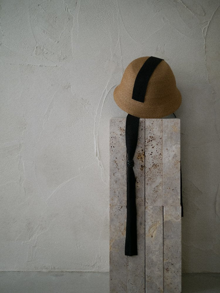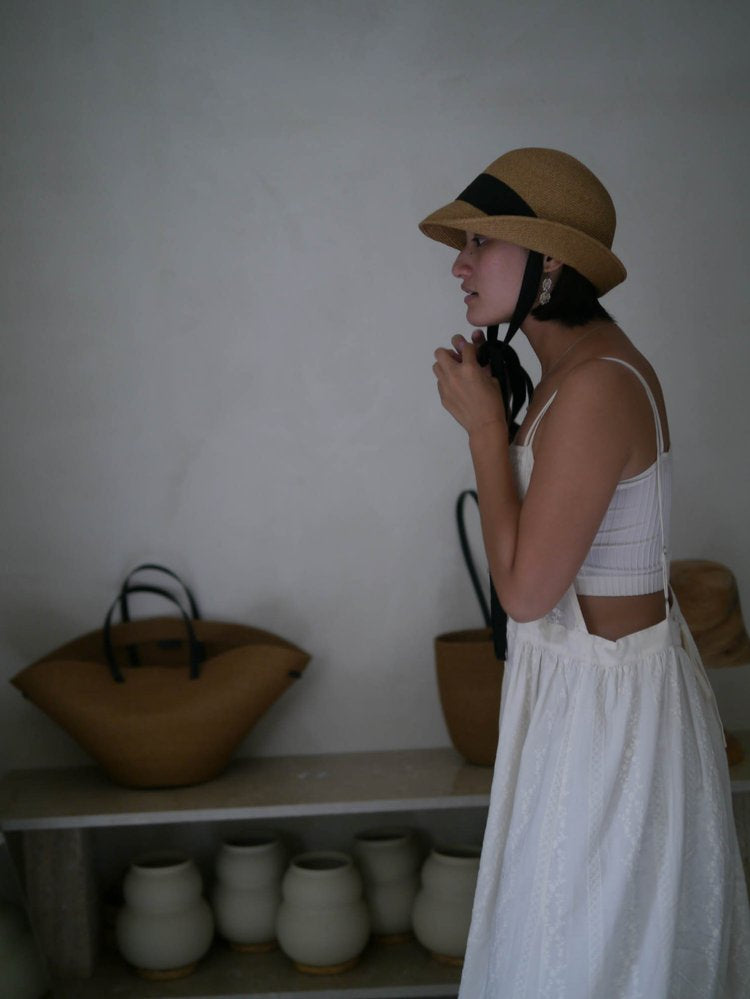 A simple and light weighted bucket hat derived from the gourd shape. The linen hat ribbon comes with a woven ring.
