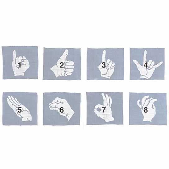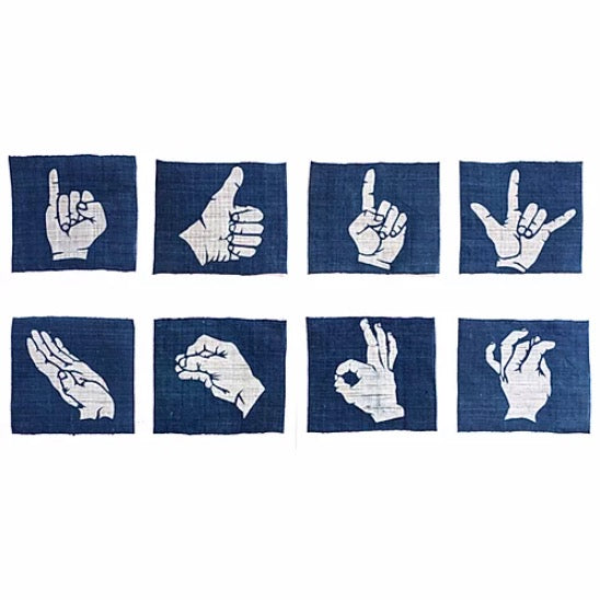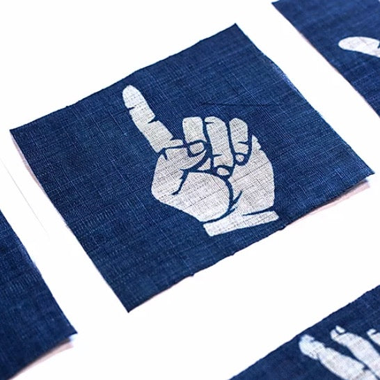 Using a level and narrow piece of Ramie fabric, using the stencil dying technique we designed various hand motifs. On the back the manufacturing year of the sukumo’s production is stamped.