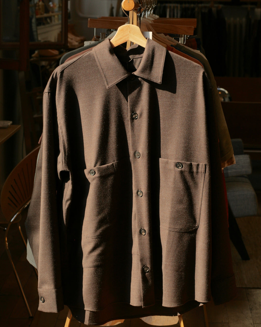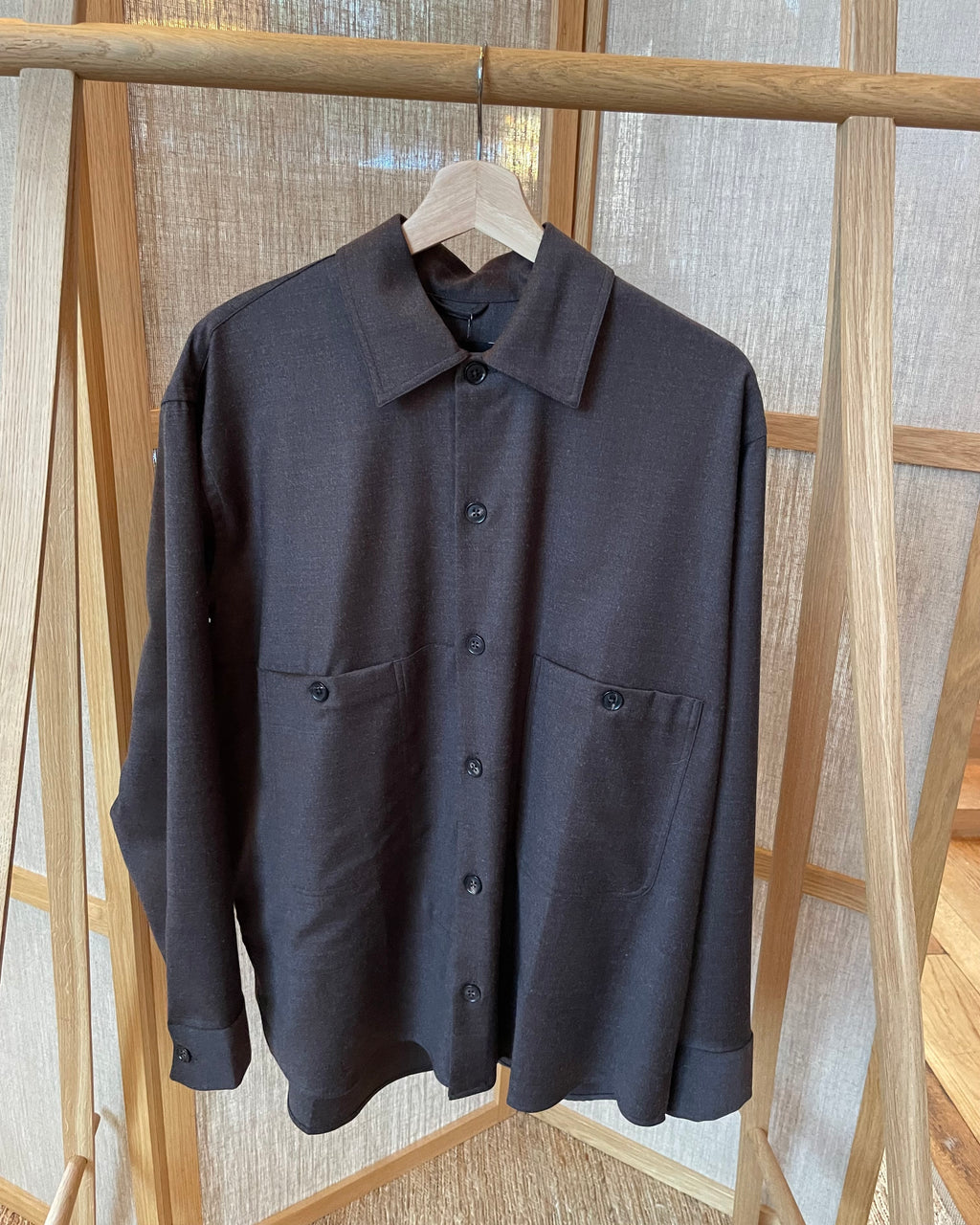 This overshirt is made of a soft wool flannel twill. It has a loose fit and asymmetrical details, with patch pockets on the front. The details of it include a collar that is slightly spread and buffalo horn buttons.