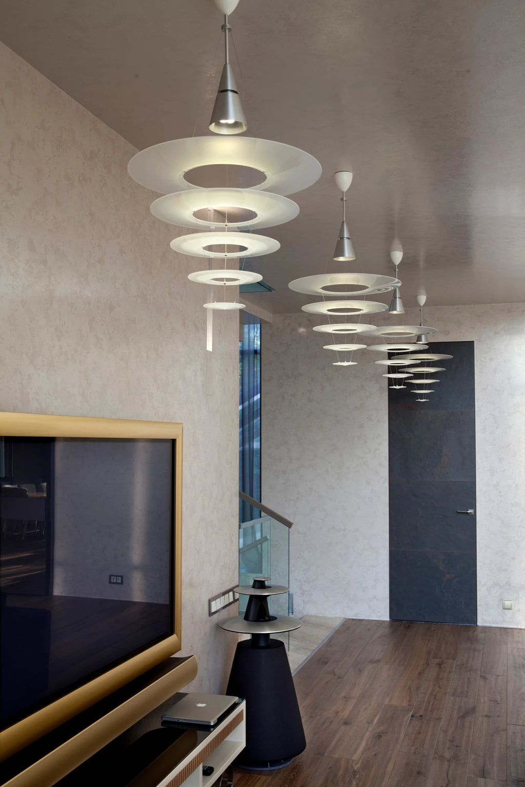 Enigma 545 was designed by Japanese designer Shoichi Uchiyama in 2007 and extends the Enigma family. Enigma 545 is a larger version of Enigma 425, based on the design idea of floating shades held by ultrathin wires, providing a transparent and light expression. The name enigma stands for ‘mystery’, referring to the fact that the shades appear to hover when viewed illuminated from a distance. The design fitted well with Louis Poulsen´s product philosophy, and was a new interpretation of the multi-shade system - Japanese grace combined with Scandinavian simplicity. In 2018, the original aluminium version is joined by a new, black edition, expanding the design’s decorative possibilities, and creating a serene visual and atmospheric effect as it shapes and channels light.