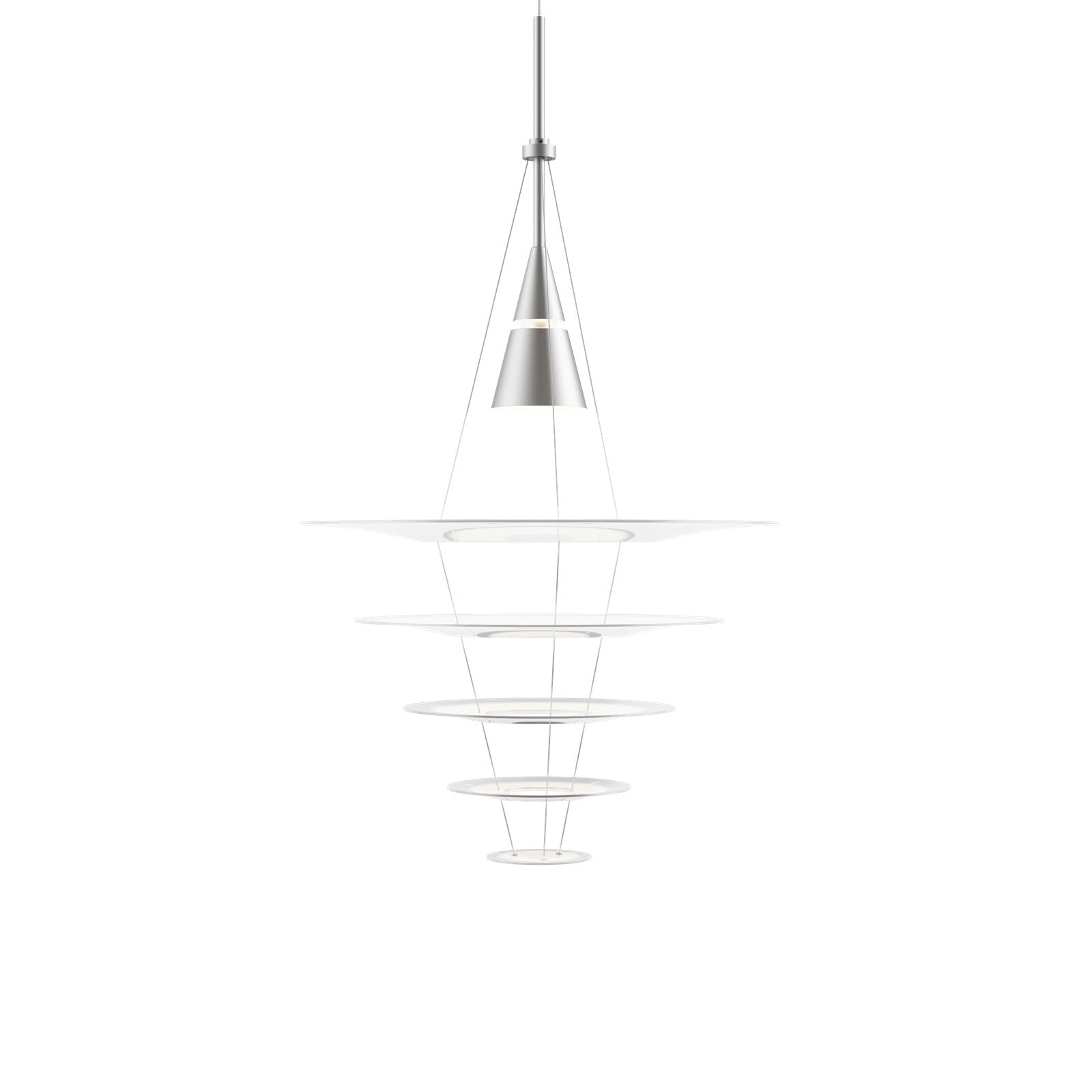 Cone and pendant tube: Lacquered or wet painted brushed aluminium. Wire: Stainless steel. Shades: Acrylic.