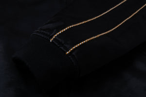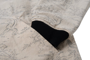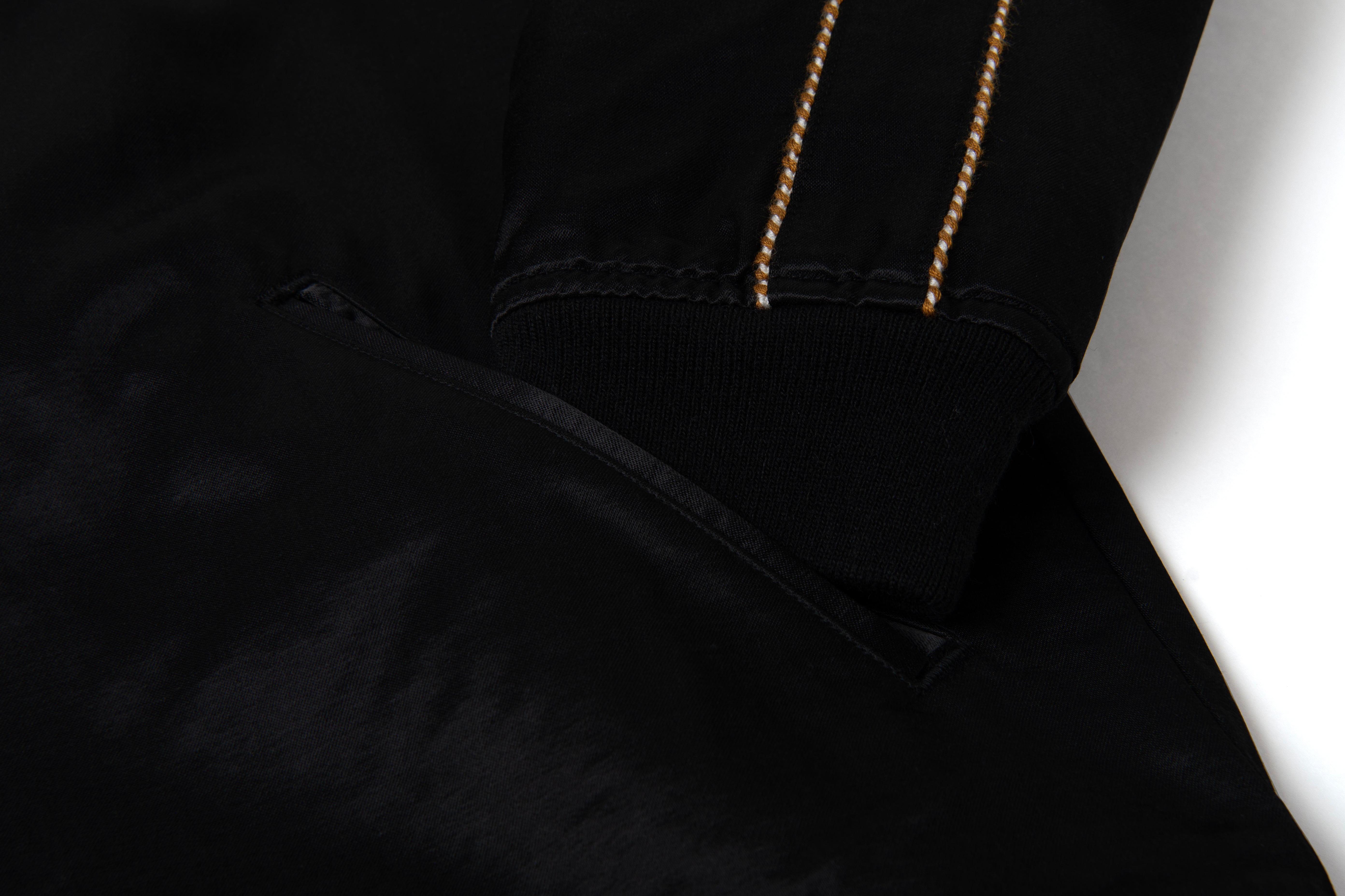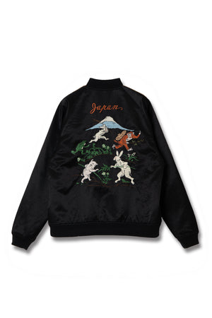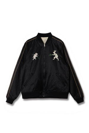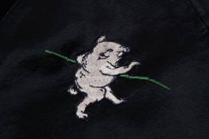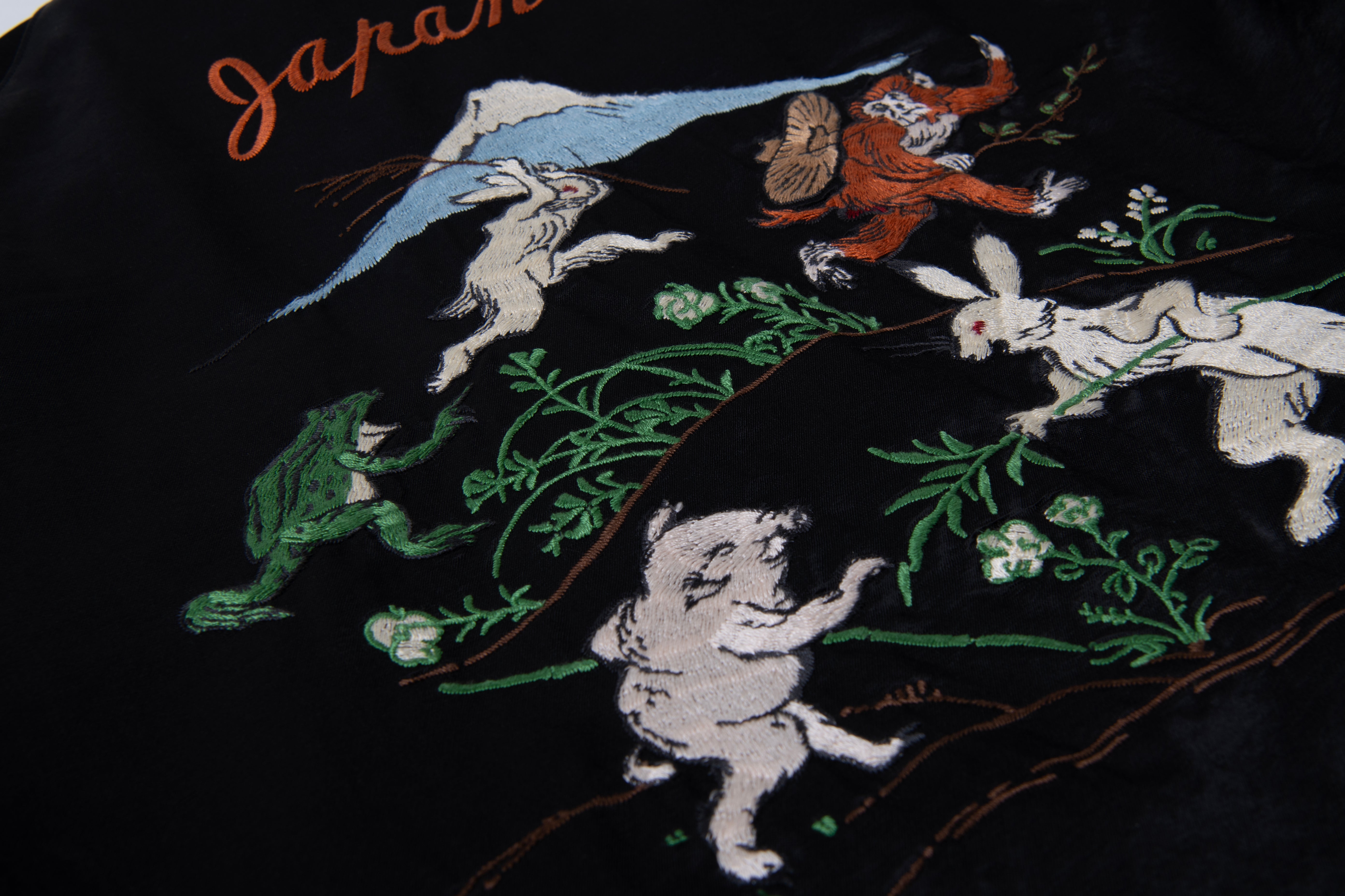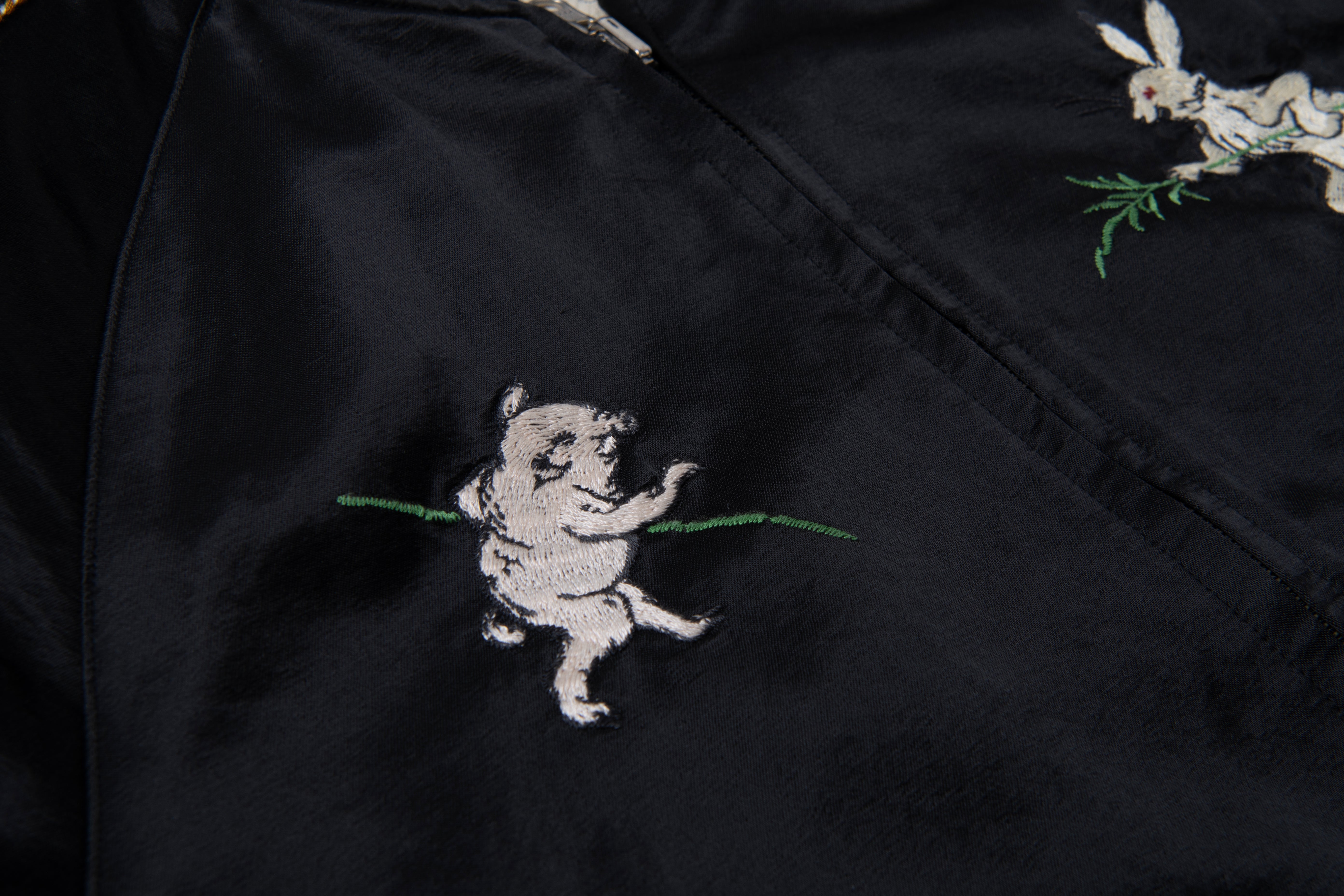 This striking“Sukajan”jacket blends traditional Japanese aesthetics with modern craftsmanship. The front is made from a glossy cotton-rayon blend, adorned with bold yet elegant horizontal embroidery that adds character and charm. On the back, an original Kasuri-inspired textile takes center stage—created using a meticulous printing technique that closely mimics the look of handwoven Kasuri. The design draws inspiration from the iconic Chōjū-giga (Caricatures of Birds and Beasts), reimagined in intricate detail. Hidden among the whimsical animal motifs are playful pigs—a signature nod to Studio D’Artisan’s distinctive sense of humor and creativity.