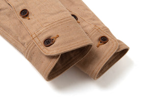 Made with the same Fox Cotton herringbone fabric, this shirt highlights the cotton’s original color and raw texture. The thick and sturdy fabric gives it a jacket-like feel—something you can easily throw on as a light outer layer. Finished with refined nut buttons, it’s a timeless piece with a naturally >grounded presence.