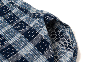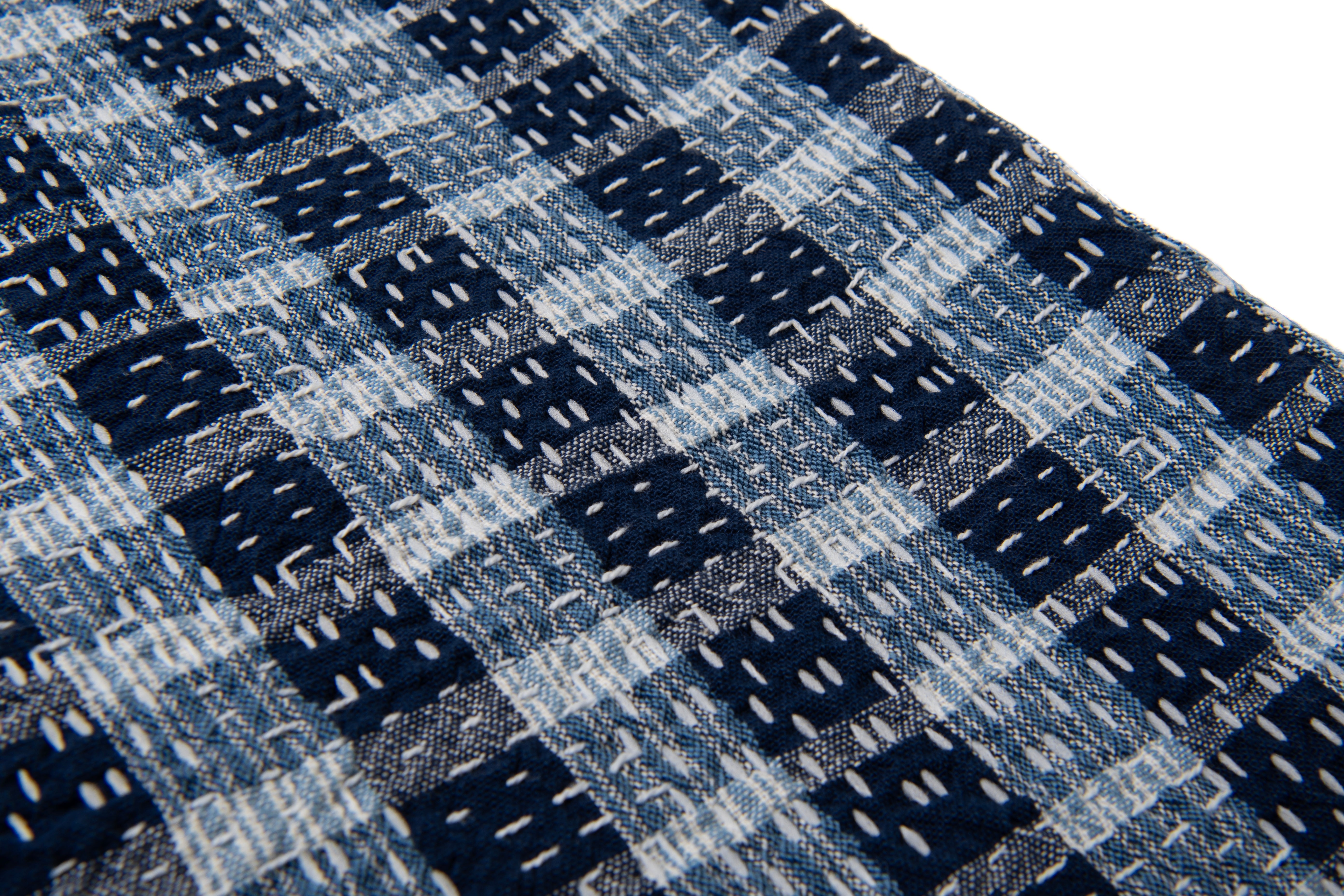 Studio D’Artisan has reimagined this traditional spirit with a modern touch through its original Indigo Noragi Sashiko Dobby fabric. Woven from three types of indigo slub yarn, the fabric captures a softly faded depth of color—like a well-worn piece passed down through generations. The intersecting stitches vary in direction and type, evoking the warmth and spontaneity of hand sewing. The fabric is designed to shrink with each wash, creating a richly textured, three-dimensional surface over time. This collection is a contemporary tribute to Japan’s folk workwear heritage—fusing time-honored aesthetics with the pride and precision of modern Japanese craftsmanship. The spirit and aesthetic sense of Noragi, a traditional Japanese workwear, has been reconstructed with the skill and pride of modern craftsmen -- the unique and distinctive "INDIGO NORAGI SASHIKO" has been born.
