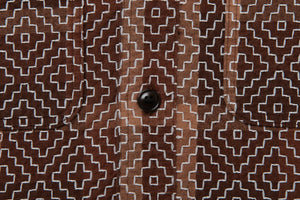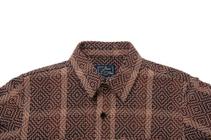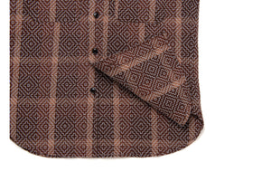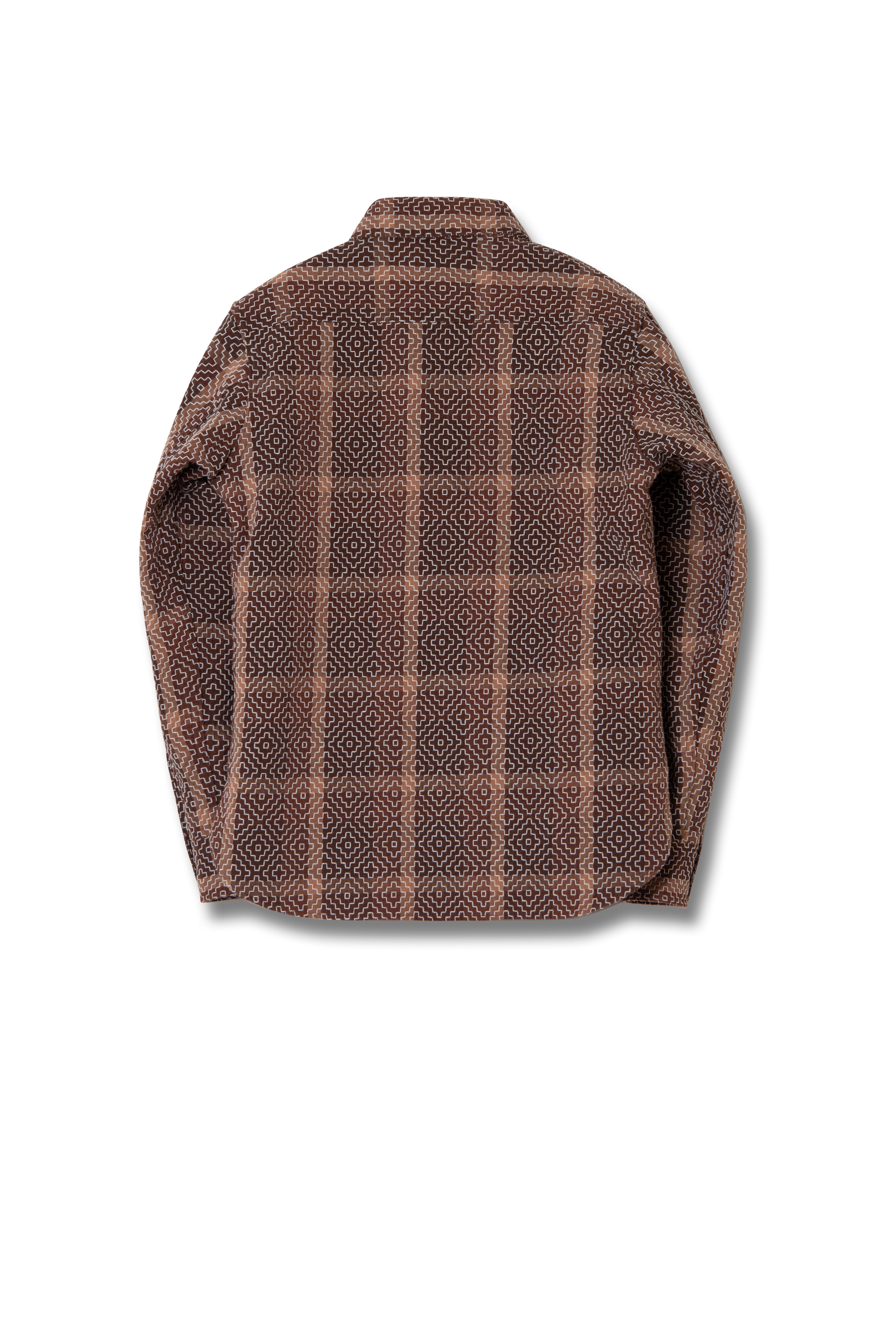 This coach jacket is made from the original "Kakishibu-zome Noragi Sashiko." The Kaki-shibu Some (persimmon tannin dye) is carefully adjusted to create a check pattern using three different colors of persimmon tannin-dyed yarn. Vertically and horizontally, the sashiko stitching features a traditional persimmon leaf design. The fabric undergoes a high-temperature wash, allowing the difference in shrinkage between the yarn count and material to create a textured, hand-sashiko-like bulge. The collar is made of corduroy and lined for added comfort.