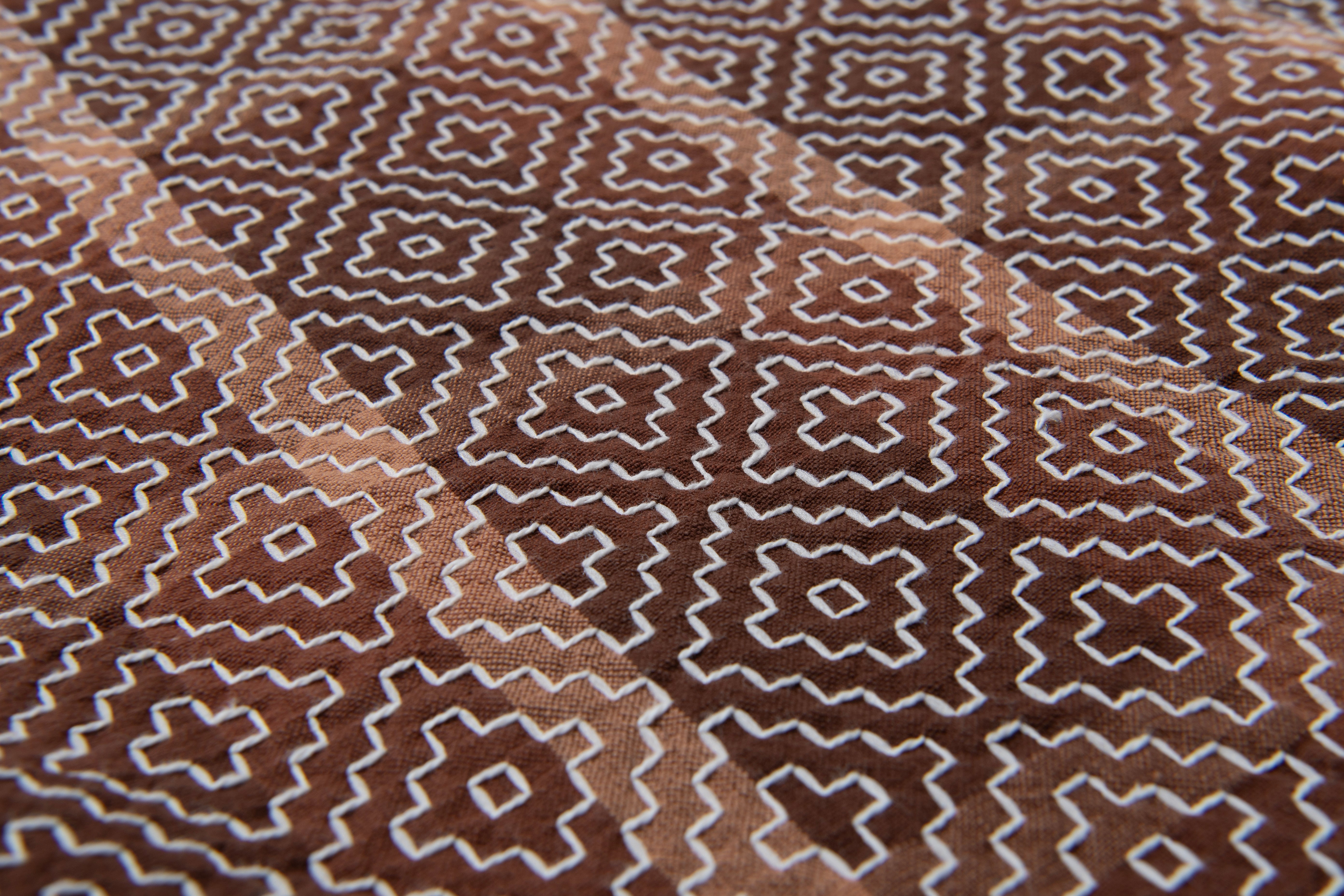 The unique combinations of patterns and the warmth of hand-stitched sashiko created during this process exude unparalleled beauty. D’Artisan has expressed the "Noragi Sashiko" in this collection using persimmon-dyed thread. Three distinct shades of persimmon-dyed thread were created to form a checkered pattern by adjusting the persimmon dye and the number of dyeing cycles.
